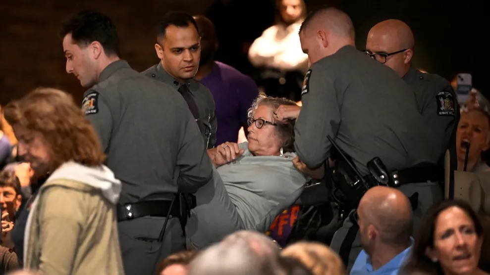 When Lawler gave a non-answer, Feiner didn’t accept it. She bravely continued to ask her question and was told to leave. When she refused, state troopers lifted her out of her chair and carried her out of the meeting. The audience erupted in calls of “shame, shame, shame” against Lawler and the troopers.