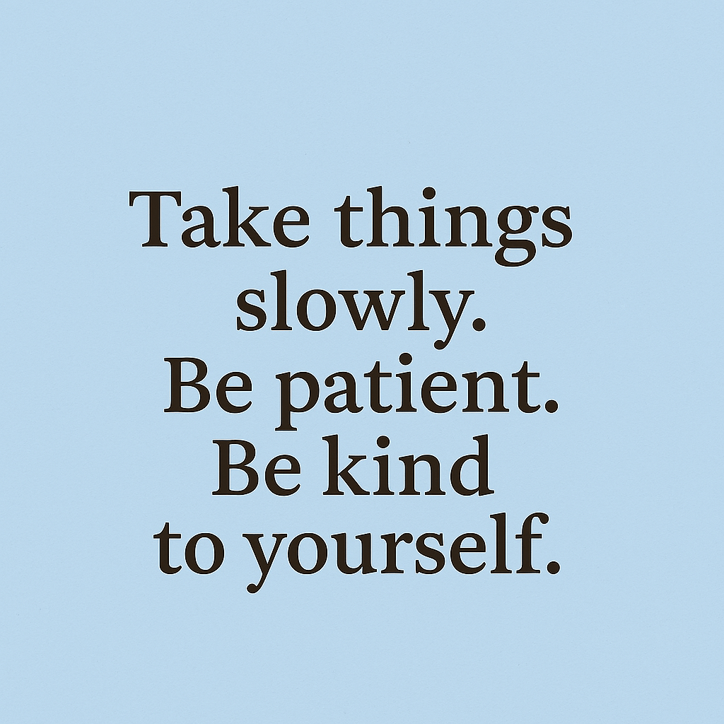 Ok – so let’s come back to the trifecta … here’s my homework for the next few weeks: “Take things slowly. Be patient. Be kind to yourself.”